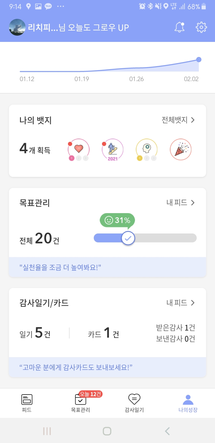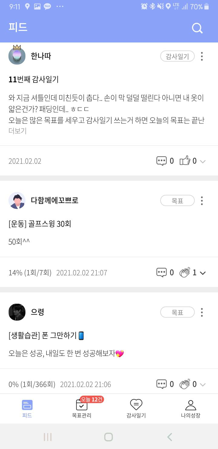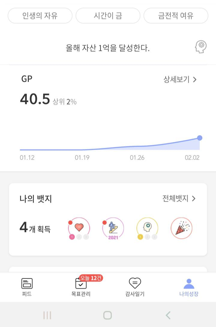 큰 메뉴는 피드, 목표관리, 감사일기, 나의 성장이 있는데요.