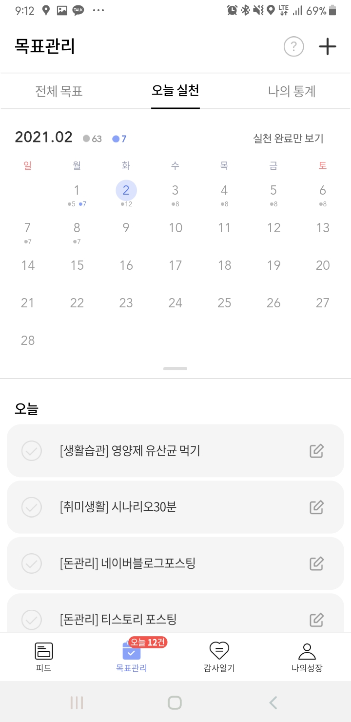 체크 모양을 누르면 체크가 되면서 실천 완료가 된답니다.