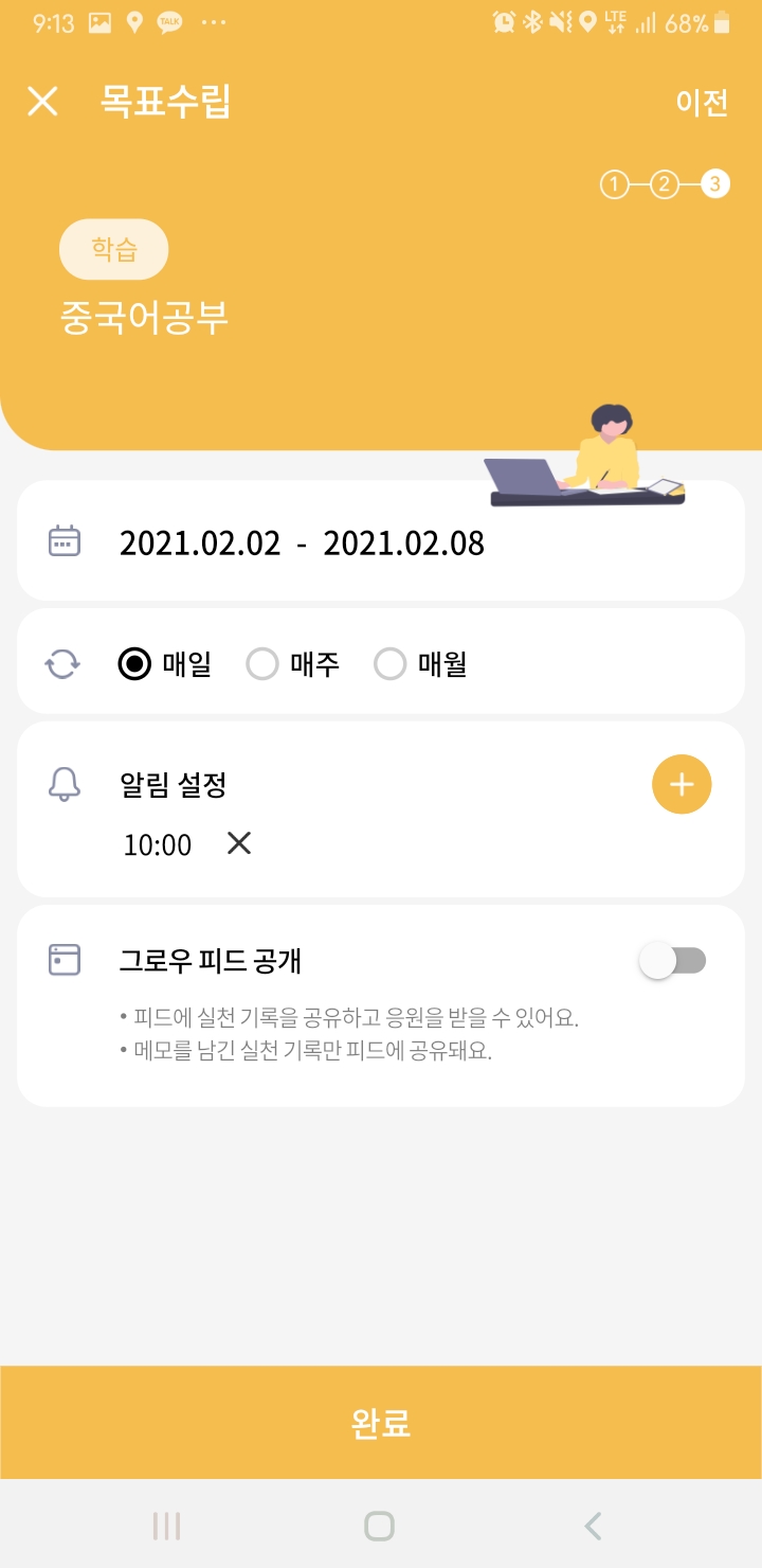 목표를 실천하는 기간과 주기, 알림 설정, 그로우 피드 공개 여부를
